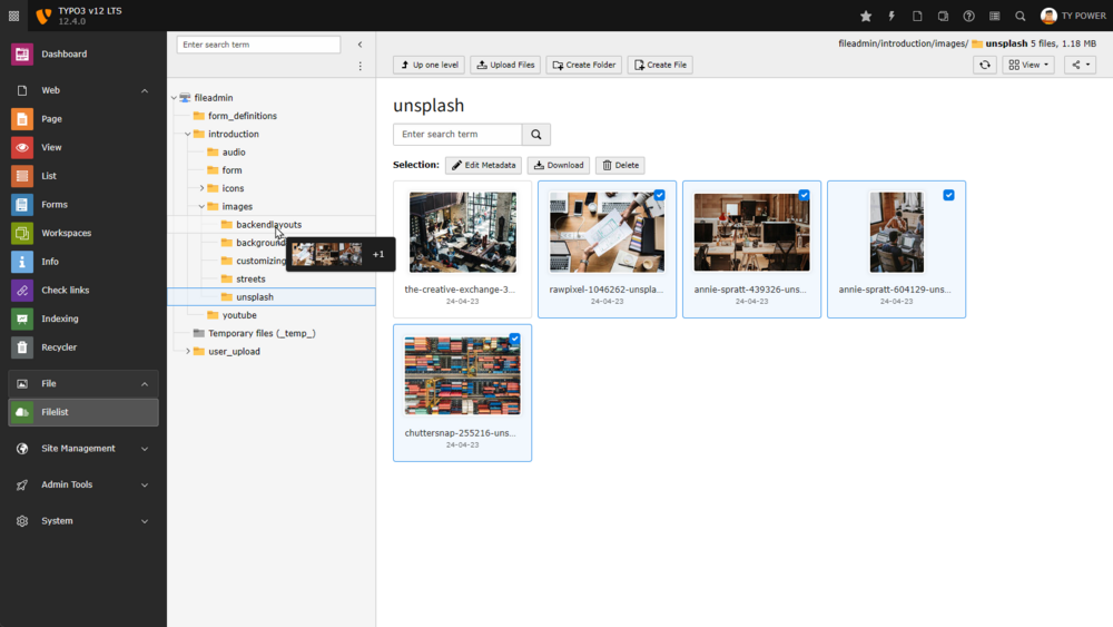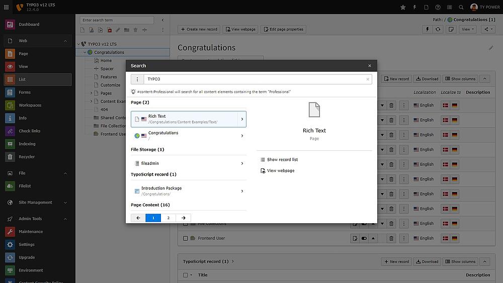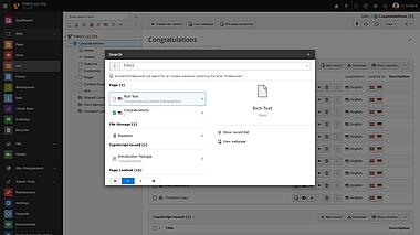 El módulo editor de páginas se ha simplificado y optimizado para mejorar su uso. La gestión de archivos también se ha hecho más accesible con una nueva vista en mosaico y la función de arrastrar y soltar. Además, los resultados de búsqueda aparecen a medida que se escribe para ayudar a encontrar más rápidamente la aguja en el pajar. Esta nueva búsqueda en vivo se puede abrir en cualquier momento en TYPO3 utilizando la combinación de teclas Ctrl + K o Cmd + K. Además, el nuevo editor de texto CKEditor ofrece nuevas funciones que aumentan la productividad en la creación y edición de textos.