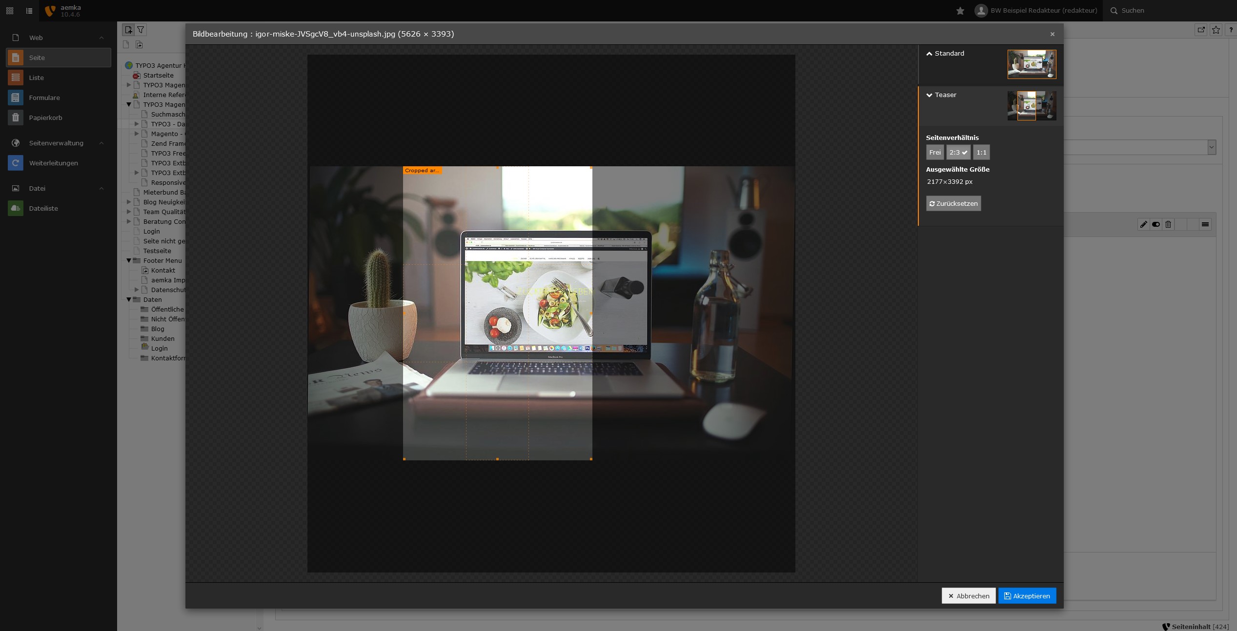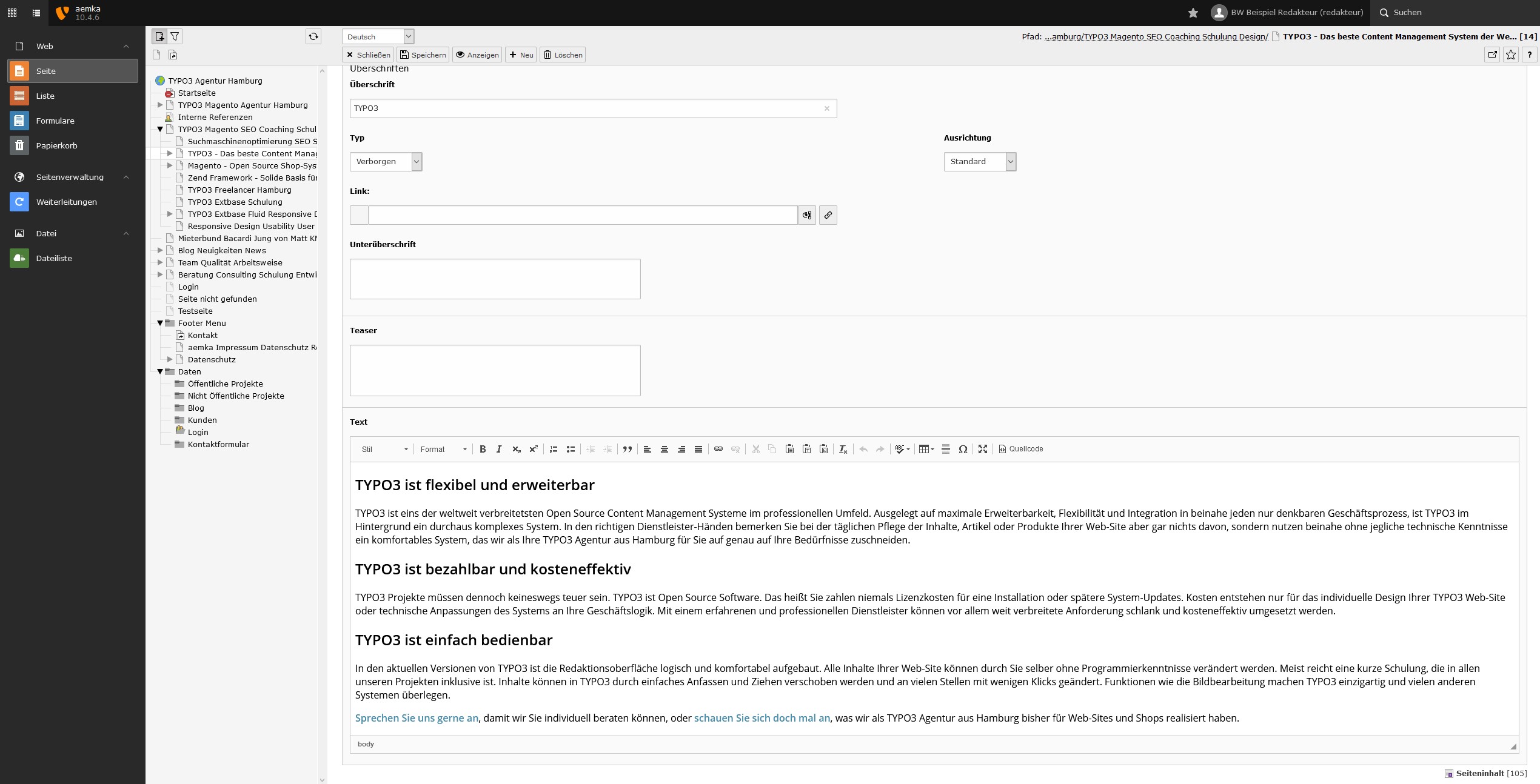 Die Redaktionsoberfläche von TYPO3 ist responsive, modern, schnell und stellt den Redakteur und seine tägliche Arbeit in den Fokus. Dabei kann mit dem Computer, Tablet oder sogar mit dem Smartphone im CMS gearbeitet werden. Der moderne Text-Editor ckeditor funktioniert hervorragend bei der täglichen Text-Arbeit. Es können seit Version 8 sogar mit dem neuen "Frontend Editing" Inhalte direkt in der Web-Site bearbeitet werden ohne die Redaktionsoberfläche zu benutzen. Integrierte Bildbeschneidungs-Tools ermöglichen individuelle Bildbeschneidung für verschiedene Responsive Ansichten der Web-Site. Das System reagiert bereits auf durchschnittlichen Hosting-Paketen sehr schnell. Mit den strukturierbaren Inhaltselemente kann man auch komplexe Layouts übersichtlich bearbeiten. Per Drag and Drop lassen sich Seiten und Inhalte blitzschnell verschieben und duplizieren. Kontakt- und andere Formulare lassen sich einfach per Assistent erstellen und jederzeit anpassen. Multimediale Inhalte in Form von Audio oder Video auch von externen Plattformen wie YouTube können problemlos integriert werden. Mit einem strukturierten Seitenbaum behält man auch in komplexen Web-Sites den Überblick über Menu-Strukturen. Im Team kann man problemlos gemeinsam Inhalte bearbeiten und freischalten. Diese Liste wäre noch sehr lange fortführbar, aber die großartigen Möglichkeiten des Systems sollten jetzt schon mehr als klar geworden sein.